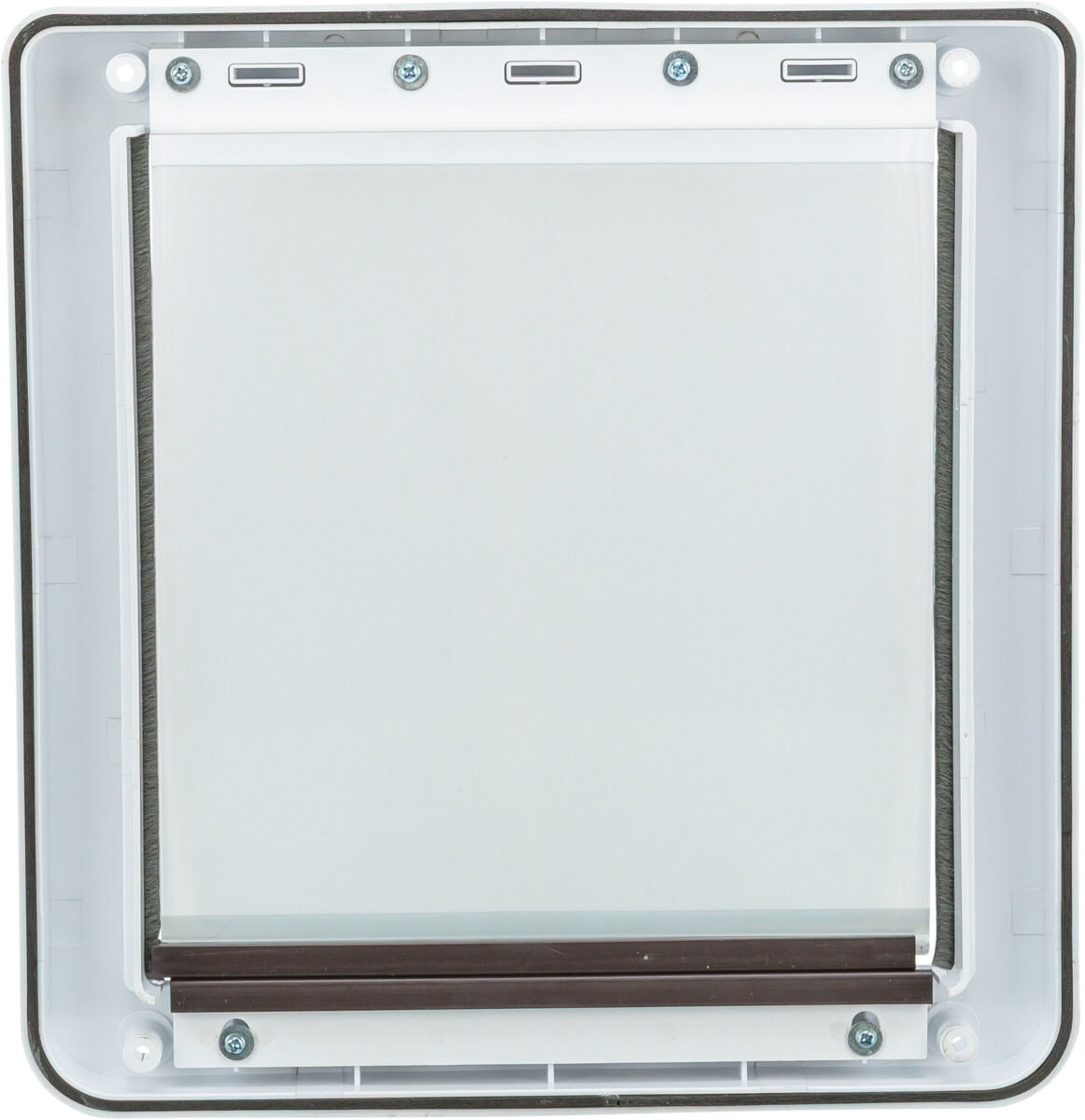- Die Metallrückwand schützt vor Eindringlingen sowie Wind und Wetter. Zum Öffnen der Freilauftür einfach die Metallrückwand durch Ziehen des Metallstiftes nach oben schieben und herausnehmen.
