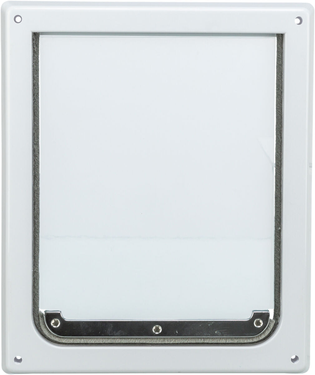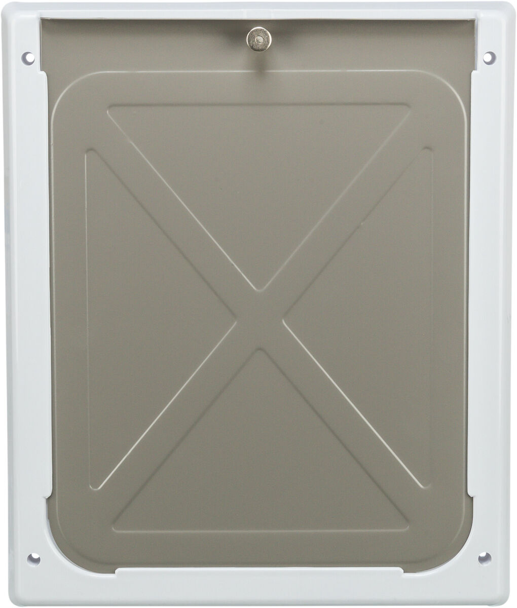 - Die Metallrückwand schützt vor Eindringlingen sowie Wind und Wetter. Zum Öffnen der Freilauftür einfach die Metallrückwand durch Ziehen des Metallstiftes nach oben schieben und herausnehmen.