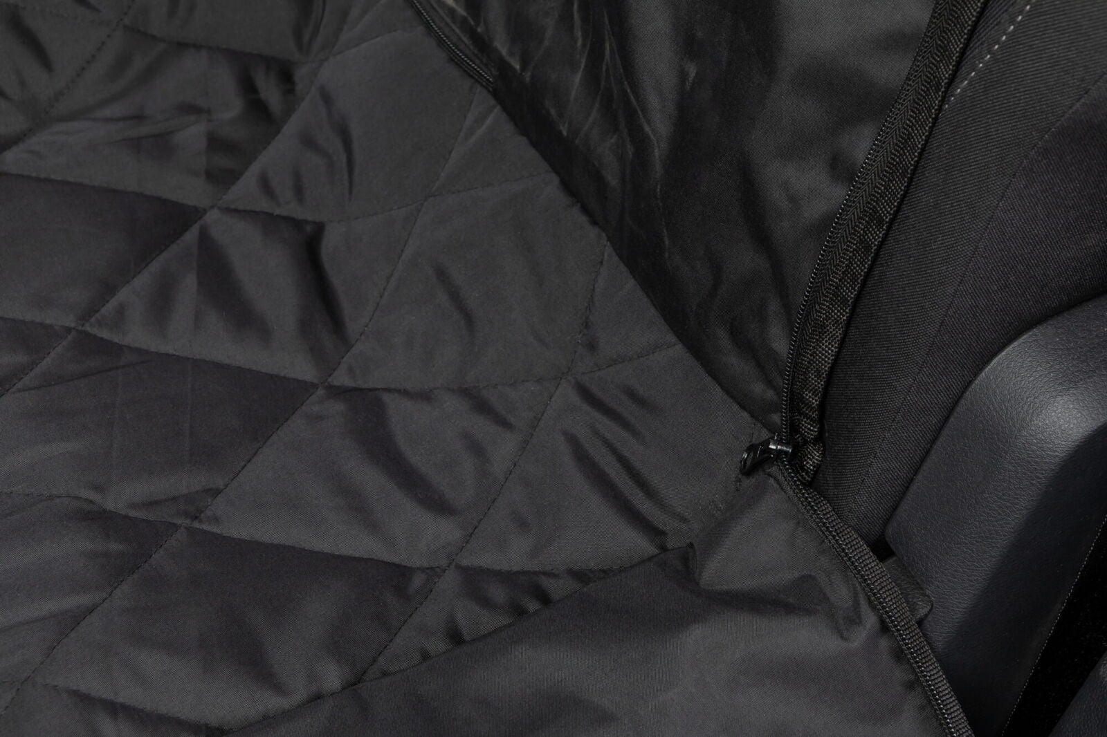 - Seitenteile können zum Ein- und Aussteigen durch zwei Reißverschlüsse heruntergeklappt werden und schützen so Polster und Verkleidungen