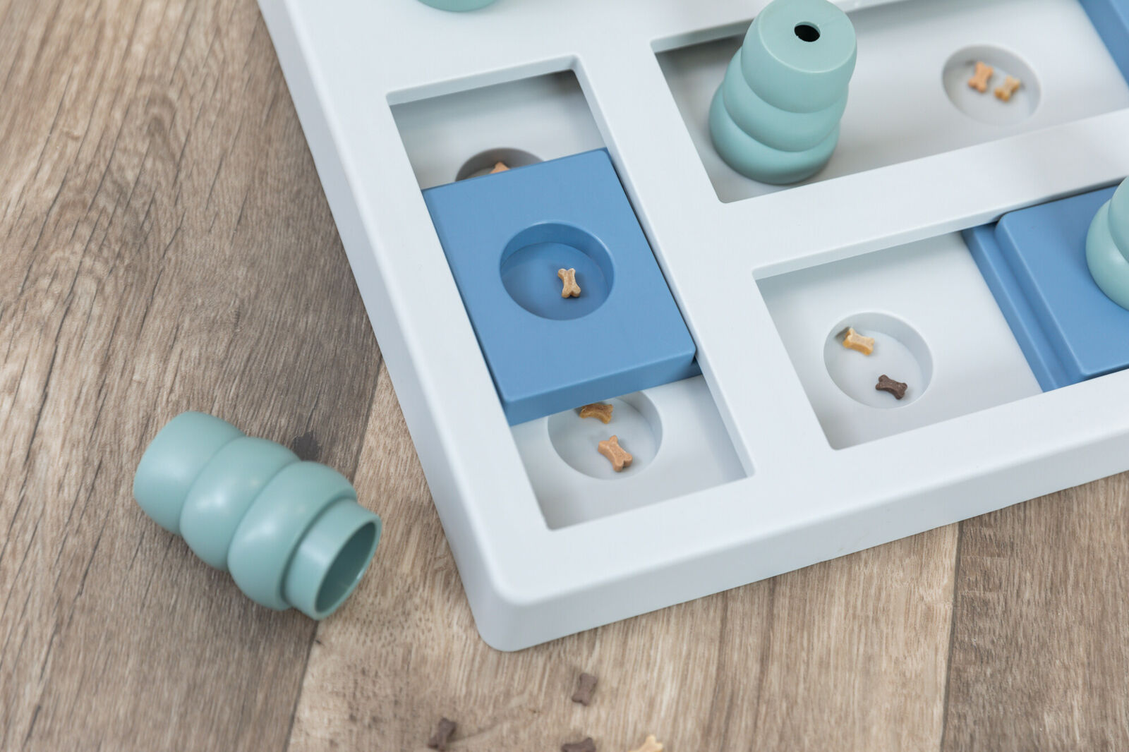 Dog Activity-Spiele sind gut fürs Köpfchen und verbessern außerdem die Beziehung zwischen dir und deinem Hund. Das Brettspiel „Chess" wartet mit vier Kegeln sowie diversen Vertiefungen und Schubfächern auf und stellt die Geschicklichkeit deines Haustiers auf die Probe. Nachdem du das Spielzeug mit Leckerlis befüllt hast, kann das Training beginnen:Die Aufgabe deines Hundes besteht darin, die Kegel und Schieber abwechselnd zu bewegen, um so an die begehrten Snacks zu gelangen. Um den Schwierigkeitsgrad zu erhöhen, kannst du die Kegel als Stopper benutzen. In der beigelegten Anleitung des Spielzeugs gibt es viele Tipps und Tricks, wie du mit deinem Hund das Training optimal gestalten kannst. Das Strategiespiel ist spülmaschinenfest und sollte regelmäßig gereinigt werden.