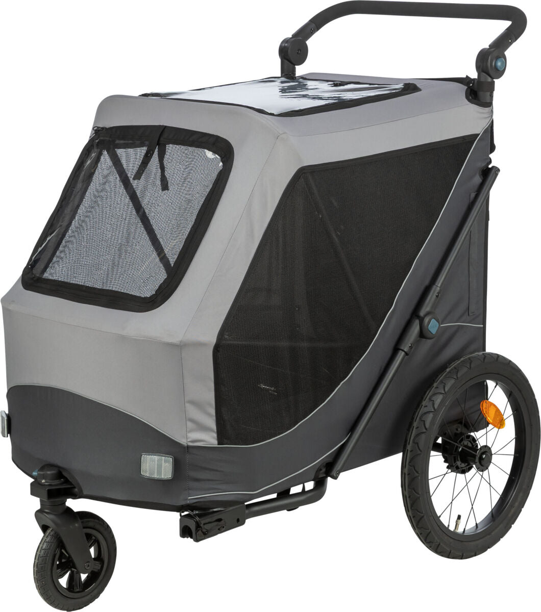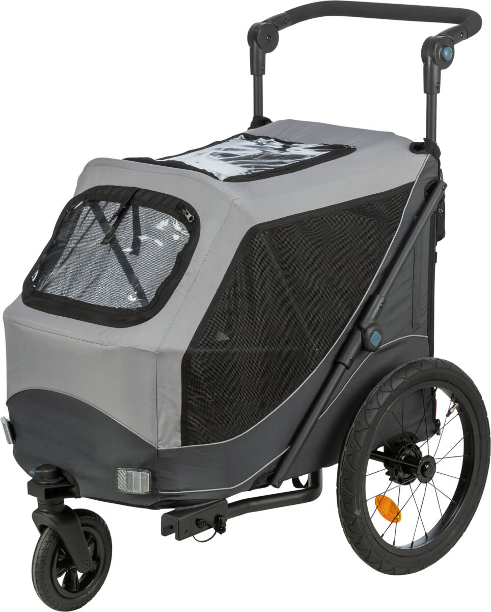 Zusätzliche Flexibilität bietet die optionale Buggy-Funktion: Mit einem passenden Frontrad (Artikel 12795) lässt sich der Anhänger im Handumdrehen zum Hundebuggy umbauen – ideal für Stadtbesuche, Spaziergänge oder ältere Hunde. Wird er nicht gebraucht, lässt sich der Anhänger schnell zusammenfalten und platzsparend verstauen.