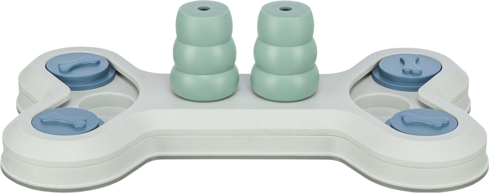 Der „Flip Bone" ist ein Strategiespiel in Knochenform für Hunde. Das Spielbrett enthält an beiden Außenseiten Vertiefungen und Schiebedeckel, in der Mitte gibt es zwei Kegel. Du kannst die Vertiefungen mit Snacks deiner Wahl oder dem Trockenfutter deines Vierbeiners befüllen, die er anschließend mit den Pfoten oder der Schnauze herausholen soll.
