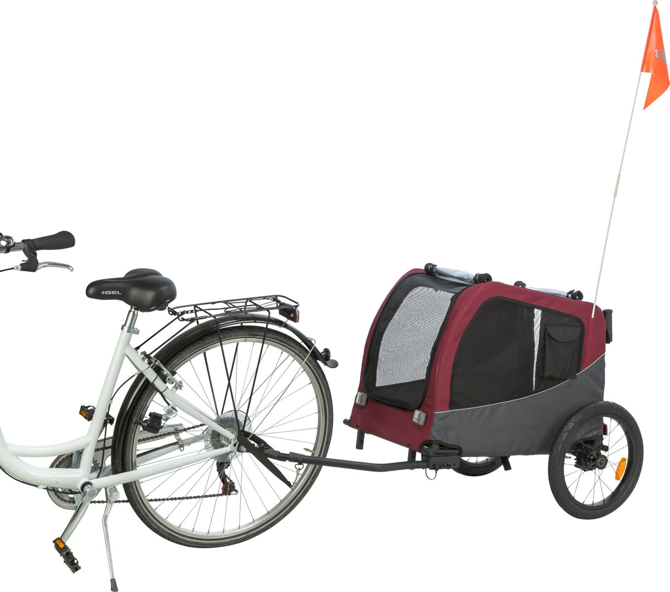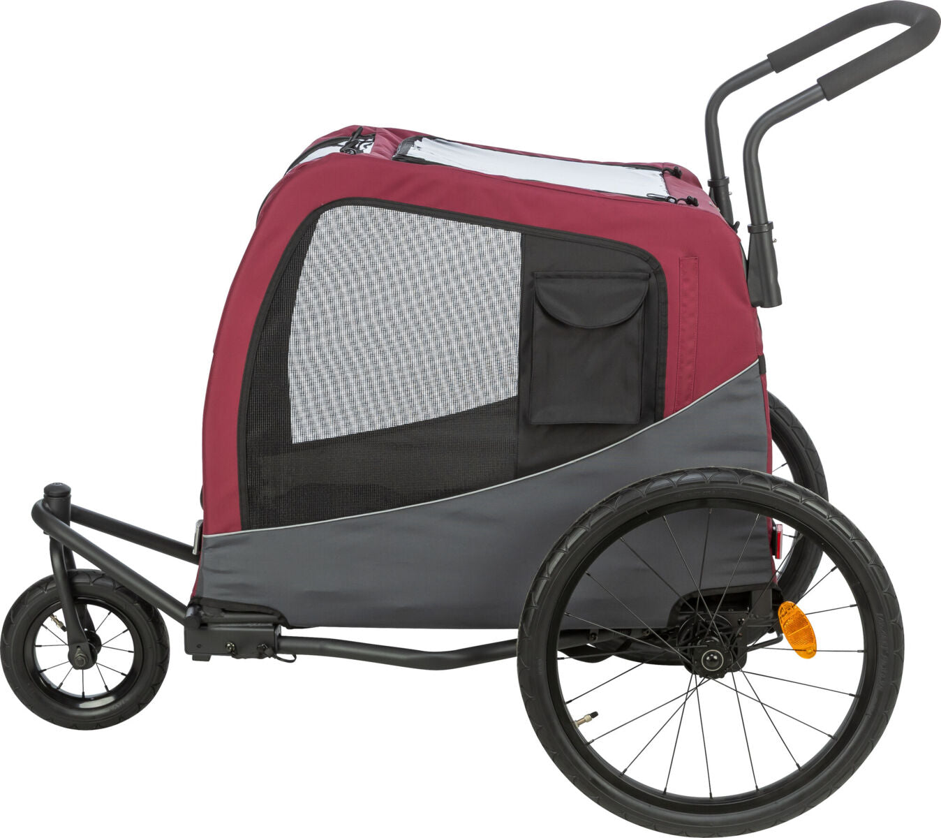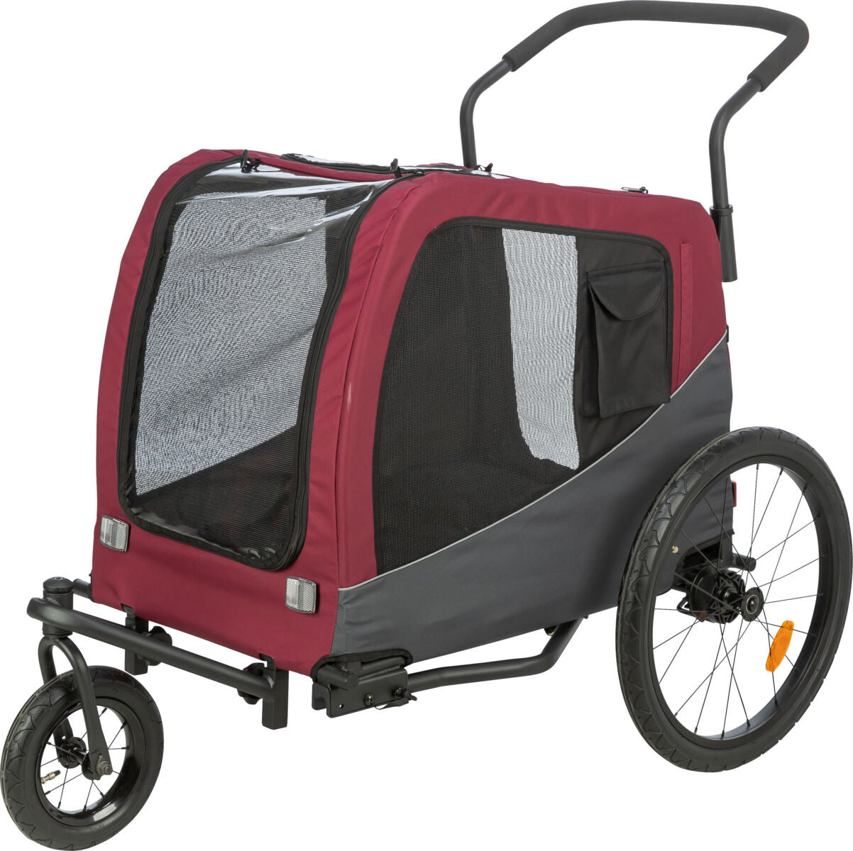 Für Sichtbarkeit im Straßenverkehr sorgen reflektierende Elemente, ein gut sichtbarer Signalwimpel mit reflektierendem Motiv sowie Schlaufen zur optionalen Anbringung eines Rücklichts (Rücklicht ist nicht enthalten). Ab Größe M ist der Anhänger mit zwei praktischen Seitentaschen ausgestattet – ideal für Leckerlis, Leine oder Trinkflasche.