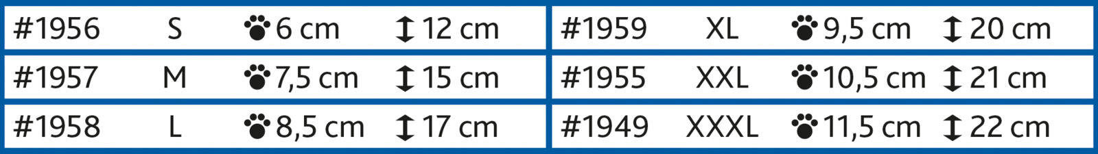 Hinweise: Sollte die Pfote deines Tieres zwischen zwei Größen liegen oder verbunden sein, verwende die nächstgrößere Größe. Kontrolliere die Pfoten regelmäßig. Besonders im Bereich von Daumen-/Wolfskralle kann es leicht zu Scheuer- oder Druckstellen kommen. Diese Bereiche müssen eventuell zusätzlich gepolstert werden.