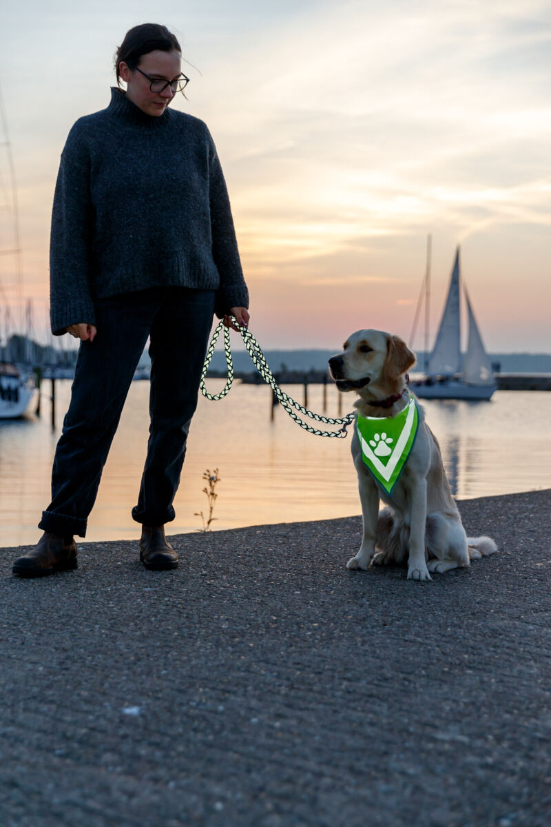 Optimale Sichtbarkeit kann durch weiteres Sicherheitszubehör, wie z. B. eine Sicherheitsweste für den Hundehalter, erzielt werden.
