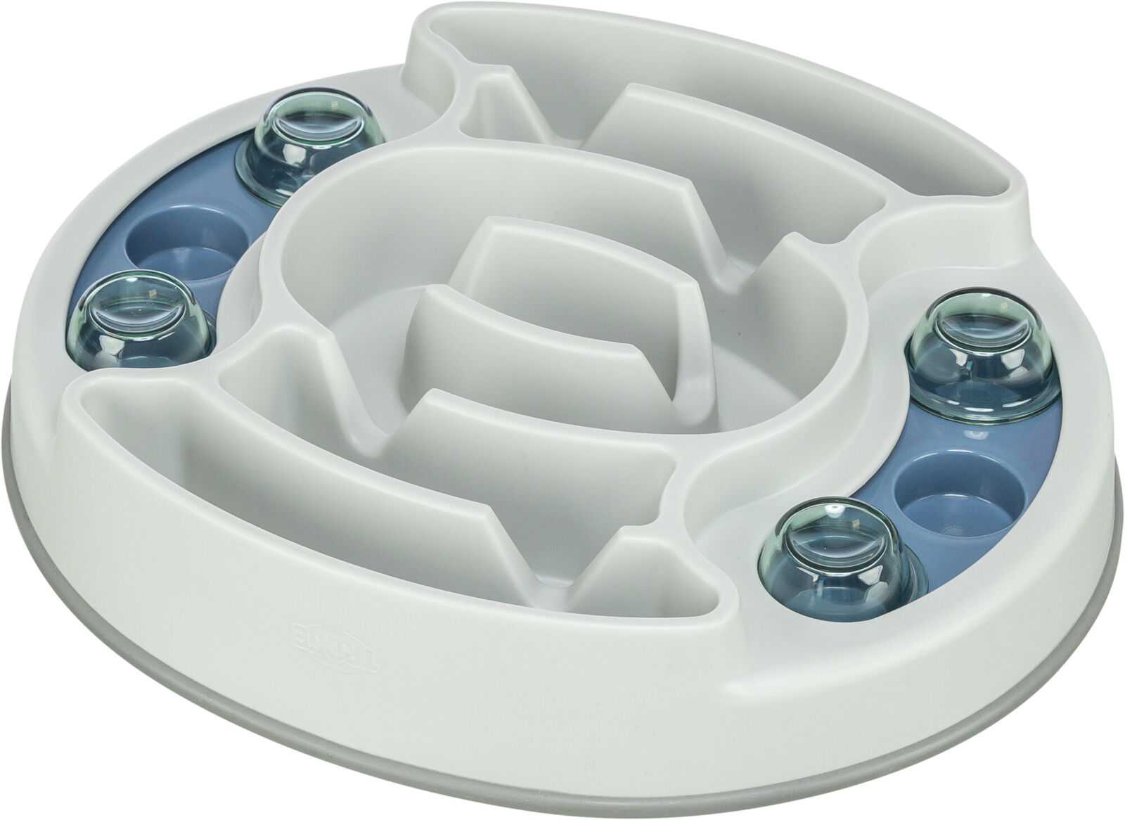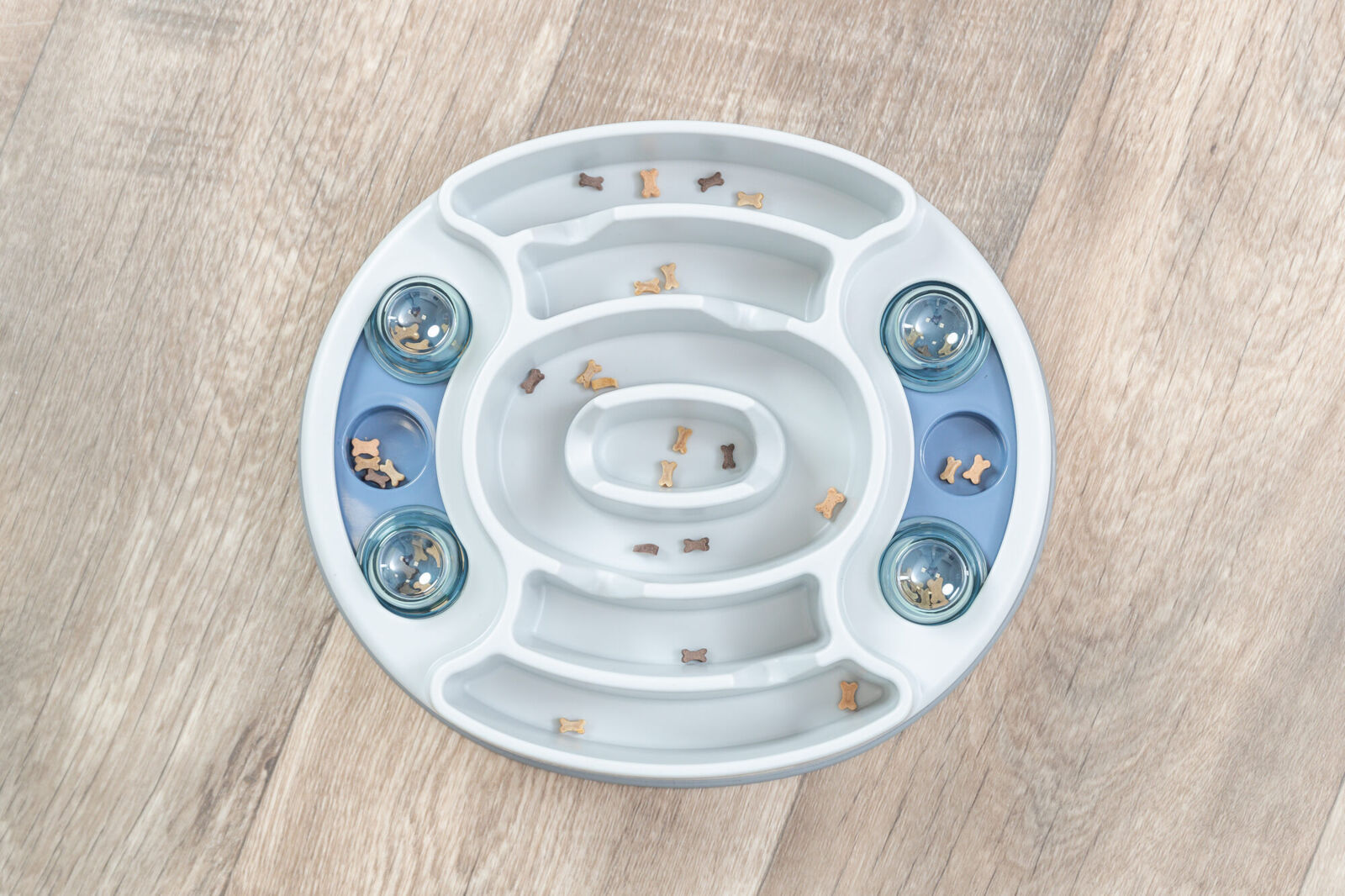 Da Hunde sehr intelligente und wissbegierige Tiere sind, wollen sie regelmäßig beschäftigt werden. Das Activity-Spiel „Slide and Feed" hilft dabei: Das Spielbrett hat in der Mitte mehrere Rillen und außen kreisförmige Vertiefungen, die mit Schiebeelementen verdeckt werden können.