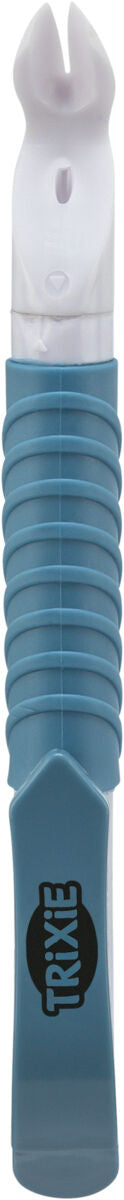 Zecken können für Hunde und Katzen eine echte Plage sein, vor allem, wenn die Parasiten klein sind oder das Fell des befallenen Tieres sehr dicht ist. So werden die lästigen Plagegeister oft übersehen und verbleiben für längere Zeit am Tier und können gefährliche Krankheitserreger übertragen. Hier verschafft der Zecken-Stift mit LED-Licht Abhilfe. Die integrierte Lampe ermöglicht es, selbst kleine Zecken im dunklen und dichten Fell von Hund oder Katze aufzufinden. Die Zecke kann dann einfach mit der Klemme fixiert und mit einer Aufwärts-Bewegung aus der Haut entfernt werden. Der praktische Zecken-Stift verfügt außerdem über einen Clip, mit dem er an der Kleidung oder der Tasche befestigt werden kann und so immer griffbereit ist.